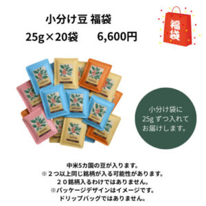 今回の福袋は、「美味しいコーヒーで、素晴らしい1年のスタートを切ってほしい」という想いで作りました。 特に「パライネマセット」「小分け袋セット」「スターター福袋セット」「オリジナルマグ・豆菓子セット」は、 確保できる数に限りがあるため、予定数に達し次第、販売終了となります。